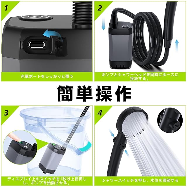 【防水で頑丈: 底の吸盤デザイン】電動シャワーポンプはIPX7防水等級を持ち、完全に水に浸かることができます、充電口には防水カバーが装備されています、ご使用の際は防水カバーが締め付けられ、使用の安全を確保することにご注意ください。簡易シャワーポンプの底に吸盤のデザインは、シャワーポンプが傾かないようにバケツの底にしっかりと取り付けられていることをします。