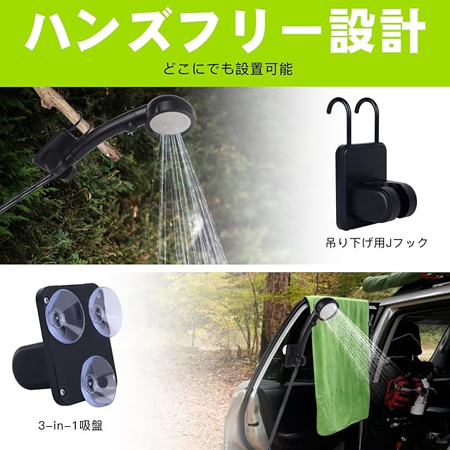 【使いやすい・豊富な付属品】ポータブルシャワーはシャワースタンド、吸盤、フックが付属しており、ハンズフリーシャワーを楽しむことができ、両手が自由になります。ブラケットと吸盤を組み合わせれば、シャワーヘッドを平らで滑らかな面に取り付けることができ、ホルダーとフックを組み合わせれば、シャワーヘッドを木の枝などに吊るすことができます。フックは単独でタオルを掛けることもでき、とても便利です。