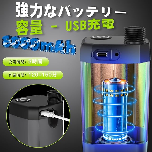 【USB充電式-6000mAhバッテリー容量】ポータブルシャワーは6000mAh大容量バッテリーを内蔵しており、フル充電状態で120-150分間連続使用できます。Type-Cポート付き電動シャワーは携帯電話充電器(5V-2A)、携帯電話電源、ノートパソコンや車のUSB出力で充電でき、いつでもどこでも充電できて便利です。コードレスUSB充電システムの設計により、簡易シャワーは場所を取らず、再利用可能で、環境に優しく、省エネです。(ポンプには水を加熱する機能がありません)