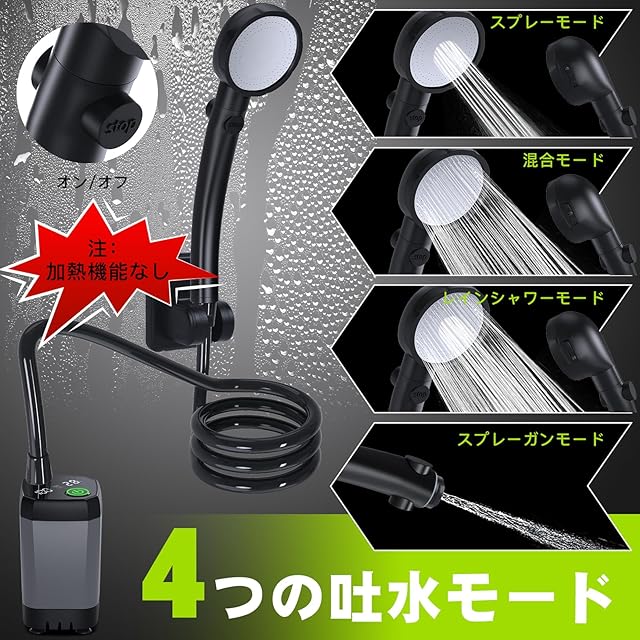 【4つの排水モード】キャンプ用ポータブルシャワーヘッドは実用的な4つの排水設定を搭載しており、様々なシーンでニーズに合わせてモードを切り替えることができます;水流調整ノブを調整することで無段階に水流を調整することができ、水流を自由にOFF/ONすることも可能です。また、アップグレードされたモーターは低騒音で作動し、アウトドアキャンプのシャワーに静かな環境を確保します。