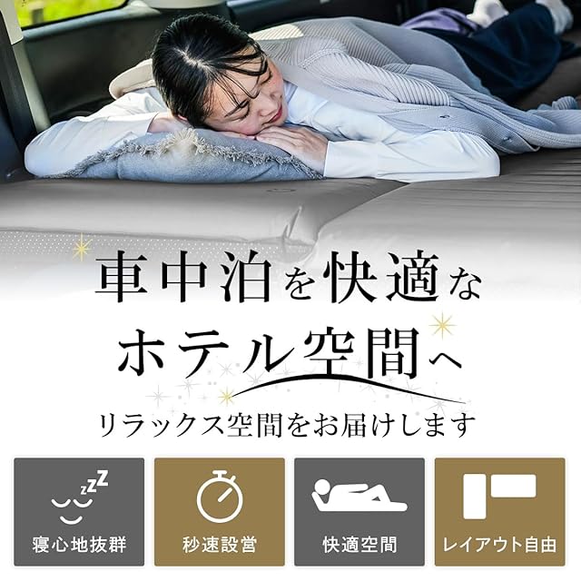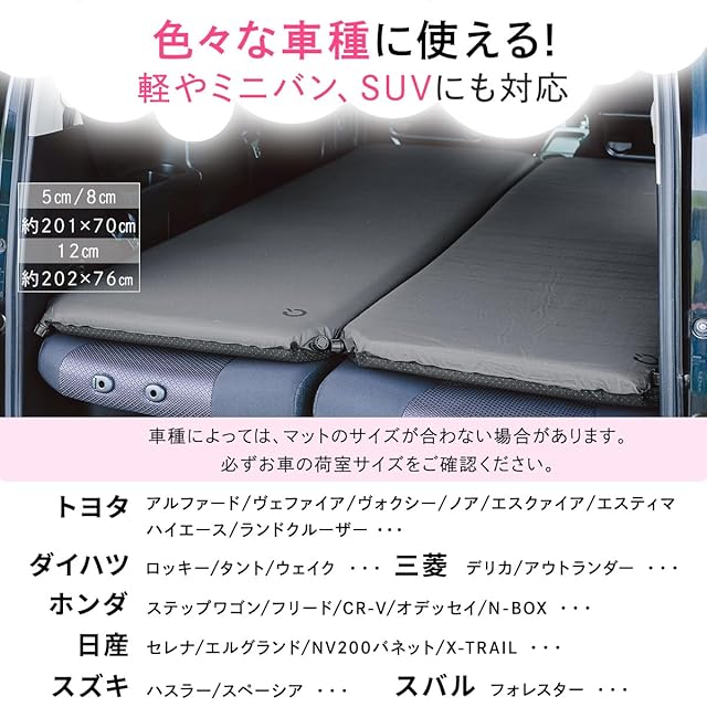 車中泊やオートキャンプに最適な厚み8cmのキャンピングマット!表地は丈夫で肌触りの良いポリエステル素材、裏地には車内やテントでのずれを防止するドット加工。