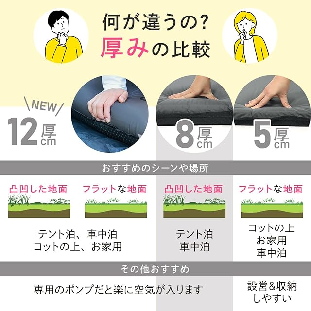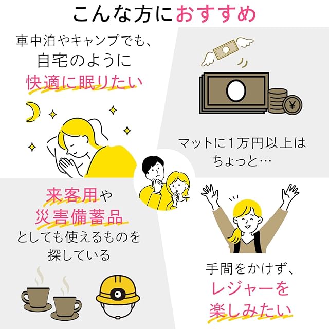 厚みがありながら大型ダブルバルブと高反発のウレタンで空気もすぐに入ります。車内の段差や地面の凹凸をシャットダウン。急な来客や防災用マットとしても最適です。