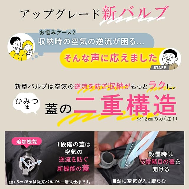 大型バルブと高密度ウレタン素材で広げるだけで自動膨張。2枚以上連結可能。