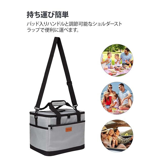 【使いやすい多機能デザイン】Kolleaクーラーバッグは、手持ち・肩掛け・斜め掛けの3通りに対応。ショルダーストラップにはクッション性のあるパッドを使用し、側面には滑りにくいグリップを配置。外側には3つのポケット(前面+両側メッシュ)があり、小物の整理に便利です。トップ部分には小さな開口部があり、クーラーボックス全体を開けずに中の物をさっと取り出せます。