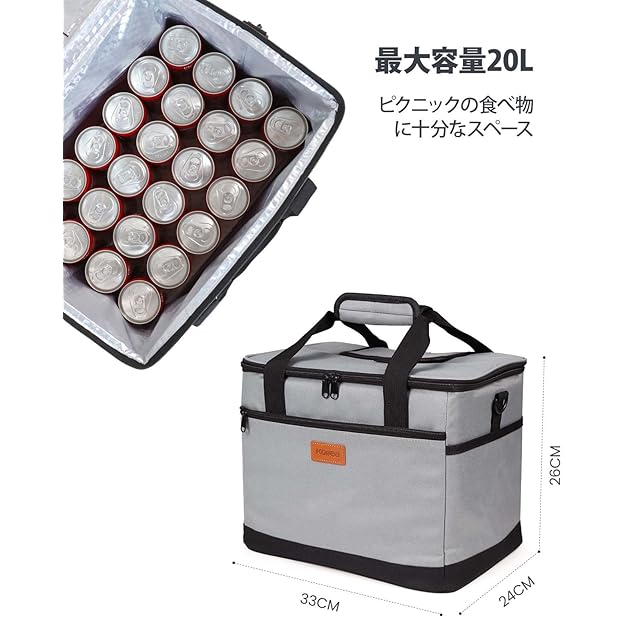 Kollea クーラーボックス 20L 4層断熱 長時間 保冷 保温 防水 漏れ防止 3WAY携帯 外ポケット3個 折り畳み収納可能 頑丈 長持ち お手入れ簡単 ソフトクーラーバッグ キャンプ 釣り BBQ ピクニック 運動会 旅行 買い物 お花見に大活躍 グレー