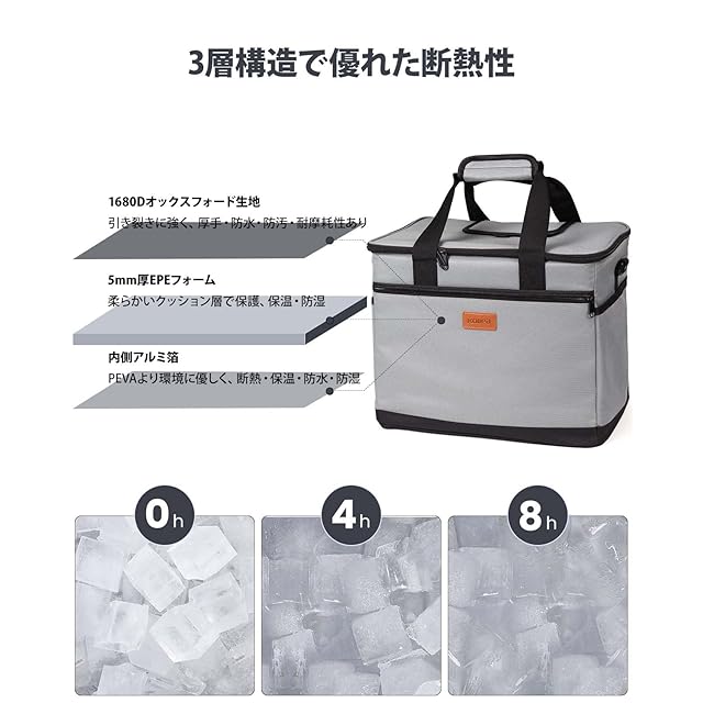 【4層断熱構造でしっかり保冷・保温】保冷バッグは1680D高密度オックスフォード生地、5mm厚のEPE断熱綿、防水仕様のアルミライナーを含む3層構造に加え、底面には断熱性を高めるPVCボードを採用。一般的な900D素材に比べて摩耗に強く、継ぎ目のないホットプレス加工で水が入りにくい構造です。約8時間の保冷・保温機能で、アウトドアや買い物に便利です。