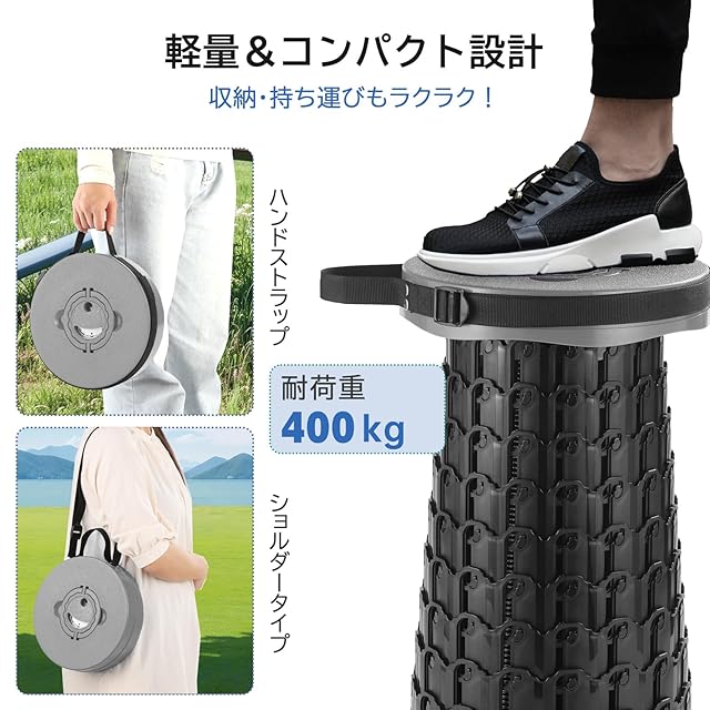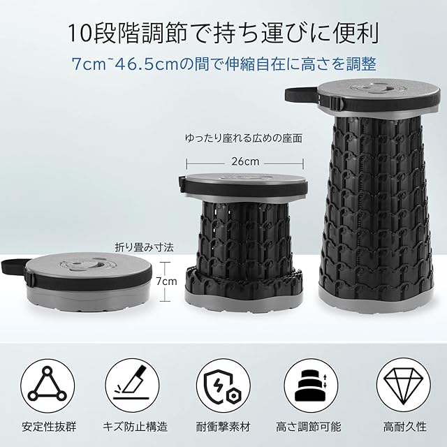【10段階の高さ調整・7cm〜46.5cmまで対応】 10段階の高さ調整が可能で、使用シーンや体格に合わせて自由にセット。低めにして足置きに、高めにしてアウトドアチェアに。お子様から大人まで快適に使える万能スツールです。