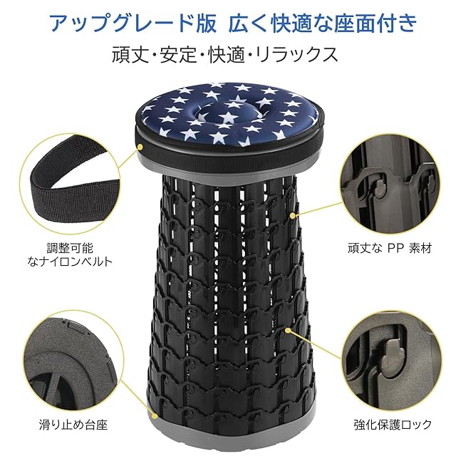 【柔らかクッション付き・長時間でも快適】 座面には厚手のクッションを採用。長時間座ってもお尻が痛くなりにくく、安定感も抜群。行列待ち、イベント観戦、花火大会、キャンプなど、どんな場面でも快適に座れます。