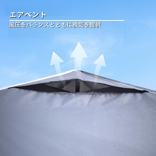 ✔ 優れた通気性と遮光・遮熱性能:3x3m タープテント専用トップカバー(キャノピー交換用)には通気孔が内蔵されており、3x3m タープテントの内部にこもった熱を効率的に放出し、涼しさを維持します。さらに高い遮光・遮熱効果を発揮し、強い日差しをしっかり遮って内部の温度上昇を抑制。同時に風の抵抗を軽減することで、強風時でもタープテントが地面にしっかり固定されます。