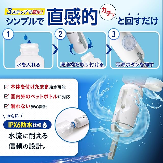 大容量タンク:200mlの水タンクを搭載しており、1回の給水で十分な洗浄が可能です。また、本体を水タンク内に収納できるため、持ち運びが簡単です。