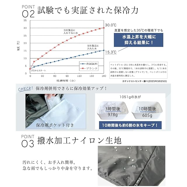 ✅【しっかり冷やす高保冷構造】内部に断熱材となるウレタンを使用し、冷たさを長時間キープ。真夏の移動やアウトドアでも安心です。また保冷力を実証するため、国内の検査機関にて保冷力テスト済み。使いやすと保冷力を両立したバッグに仕上げました。