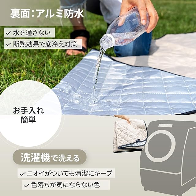 【3層構造】1)地面と接する裏面にアルミフィルムを使用しているため「防水性・断熱性・耐久性」に優れ、地面からの湿気や冷気をシャットアウトします。また、海水浴や川遊びで使う時に砂がくっつかずサラっと弾き返します。/2)真ん中に中綿が詰まっているため軽度のクッション性があります。/3)表面はポリエステルのサラサラとした素材ですので砂や草がくっつきにくいです。