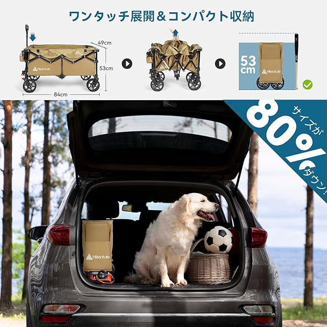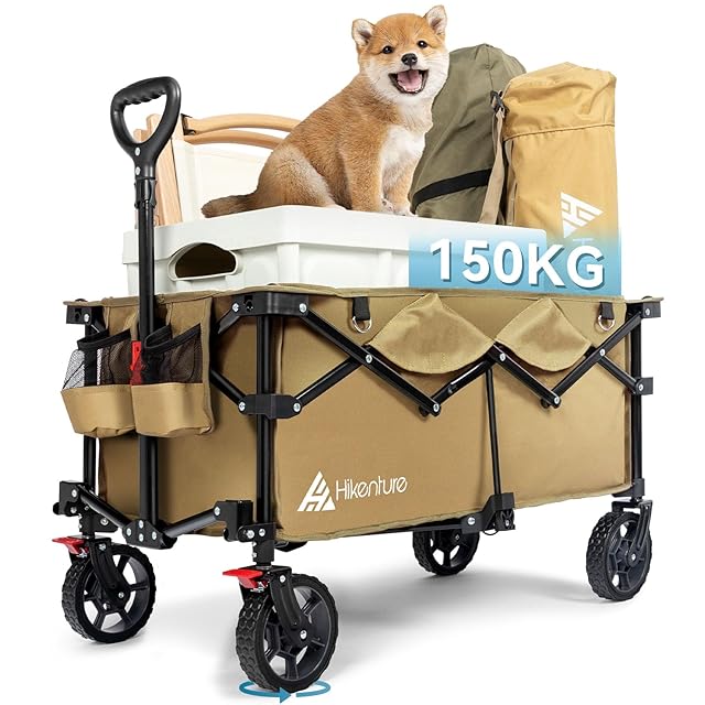 HIKENTURE キャリーワゴン 【大容量135L・耐荷重150㎏】アウトドアワゴン 【スイベル・ブレーキ付き】キャンプ カート 特許取得のコンパクト設計 キャンプカート ワンタッチ収束型 自立式ハンドルデザイン キャンプ キャリー レジャー BBQ 運動会 荷物運び 引っ越し
