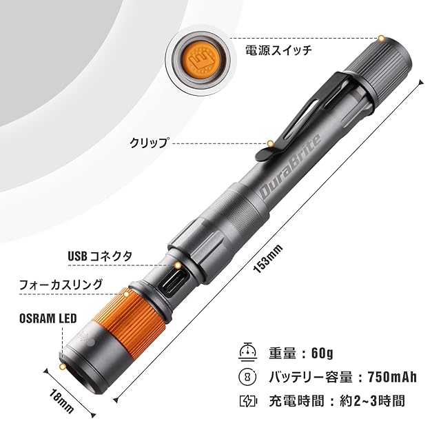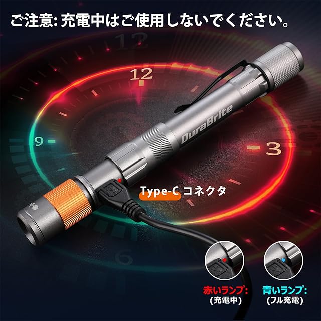 【軽量&充電式仕様】本体はアルミニウム合金を用いられ、僅か60gの重量(電池含む)で、片手で簡単に操作できます。携帯便利でご負担になりません。Type-C充電ケーブル付き、バッテリー容量:750mAh、充電時間:約2~3時間、放電時間:約2時間。(充電口を使用したい時は銀色のリングを上に押します;充電口を隠したい時は銀色のリングを下に押します。充電中は電源スイッチを押してもペンライトがOFF状態です。)