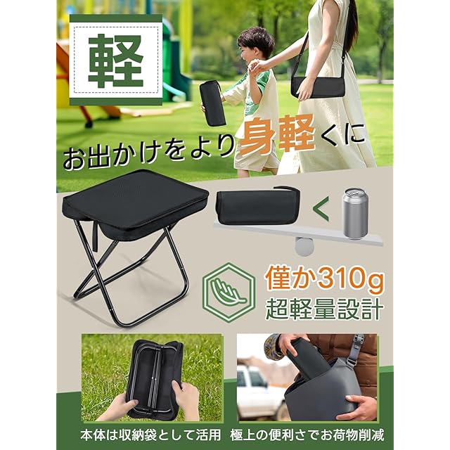 【超軽量&コンパクト折り畳み椅子】折りたたみ椅子は高強度アルミ合金フレームを採用し、軽さと頑丈さを両立します。本体は僅か310gで驚異の軽さなのに、しっかりとした耐久性を実現しました。折りたたむと傘サイズのコンパクトさで、バッグや車のトランクにサッと収納可能です。アウトドア、旅行、日常の外出の時も身軽くになります。