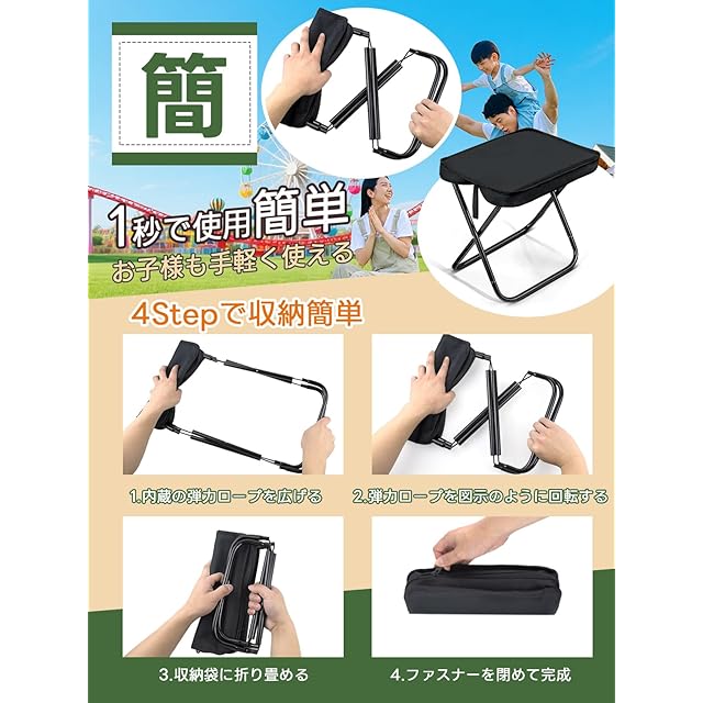 【1秒簡単使用・幅広いシーンで大活躍】折り畳み椅子は1秒で展開、4Stepで収納! 面倒な組み立て作業は一切不要です。キャンプ、バーベキュー、花見、釣り、スポーツ観戦、イベント待機など、幅広いシーンで大活躍!さらに、緊急時にすぐ使えるので、防災グッズとしても最適。車やバッグに常備し、いつでもどこでも快適な座り心地を提供してくれます。