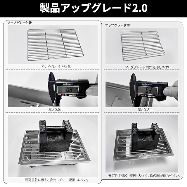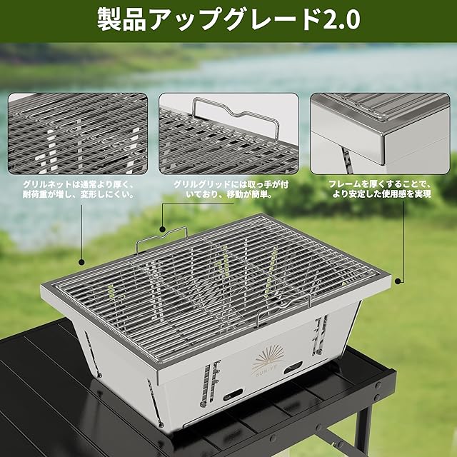 【材質】 折りたたみグリルの本体は430ステンレス鋼で作られ、430ステンレス鋼を使用することができ、耐熱性があり、変形しにくい。グリル側のフレームは201ステンレス鋼で作られ、優れた反射特性、非常にスタイリッシュです。グリルネットは304ステンレス製。