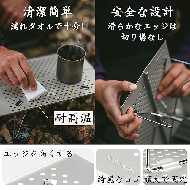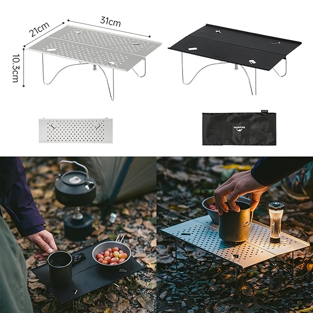 【耐熱・使い勝手】小さめテーブルは、より高い使用体験を得るため、いろいろな入念なデザインを使います。まずは素材です。アウトドアの複雑な環境に使うテーブルは、簡単に汚れやすい場合はよくあります。この二つの仕様のテーブルはアルミニウム合金の酸化処理(銀色)、アルミニウム合金溶射加工(黒色)がありますので、万が一汚れても、濡れタオルで十分です!簡単に清潔でき、衛生面もできます。使う時の安全性をできるため、テーブルエッジを高くして、カップを置く時に簡単に倒れることはありません。入念な工芸を採用するアウトドアテーブルはサイトのエッジは滑りらかで、組み立ても使用時にも手を傷つけることはありません。耐熱な卓面があるので、高温な物を置いてもいいです。こんな使い勝手なテーブルは、ソロ活動にぴったりし、テーブルを置いて、果物、お茶を楽しめる同時に、自然の景色を楽しめます。登山、徒歩中の休憩に使うのも最適です。耐熱性があるので、外食を作ったら、テーブルで安心して置けます。釣りで持つと、サイトに置け、キャンプ用品を置くのもいいです。小型なので、テント内の使用もオッケ、庭、室内使用などもおすすめです。