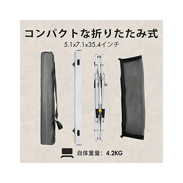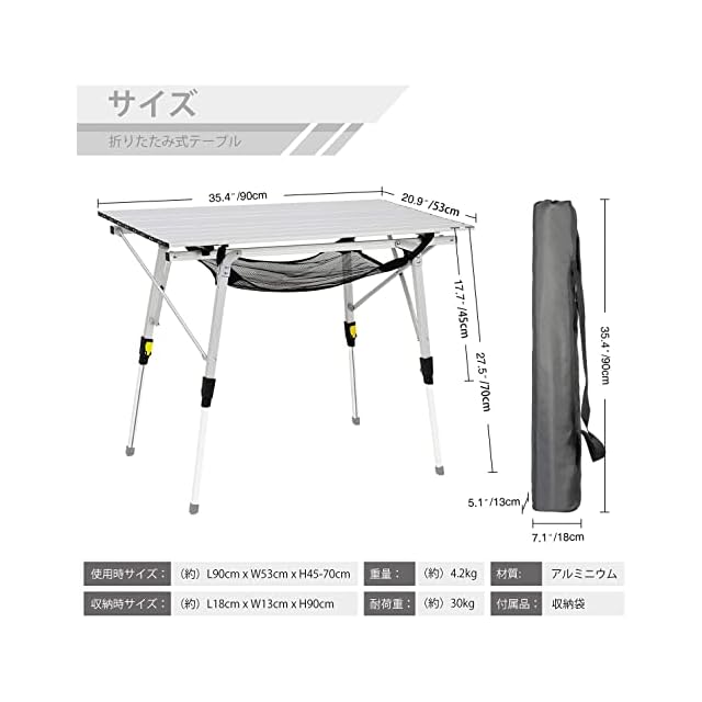 ●【アウトドアテーブルの詳細】①、素材:軽量でサビに強い航空アルミを使用! ②、自体重量:4.2KG;耐荷重:30KG。 ③、使用時サイズ:(約)長さ90cm*幅53cm*高さ45-70cm(四脚の高さも調節可能~); 収納時サイズ:(約)長さ90cm*幅18cm*高さ13cm。
