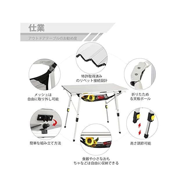 ●【組み立てはらくらく】①、ロールテーブルのフレームは簡単な収束式タイプなので、女性一人でも気軽に間もなく広げや収納できます! ②、天板の各部分は通常の老化しやすい弾力ロープの代わりに、複雑なネイルデザインで接続されています。手を天板の中に巻き込まれなく、耐久性、安定性もたっぷり!