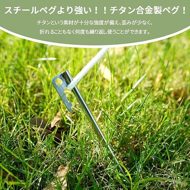 【超高強度チタンペグ】チタンペグは、どんな硬い地面でもガンガン打ち込める強度は抜群です。鍛造ペグに負けない強度を持ちながら重さはその半分から3分の1にもなります。