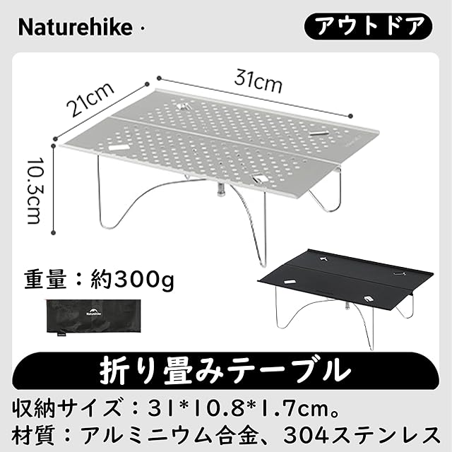 【ネイチャーハイク 折り畳みテーブル】色:ブラック、シルバー。展开サイズ:31x21x10.3cm、重量:約300g、収納サイズ:31x10.8x1.7cm。材質:天板:5052アルミニウム、テーブル足:304ステンレス鋼製。アウトドアだけでなく、自宅のリビングやバルコニー、庭での使用はもちろん、ハイキングやピクニック、スポーツ観戦など活動でも実用的です。