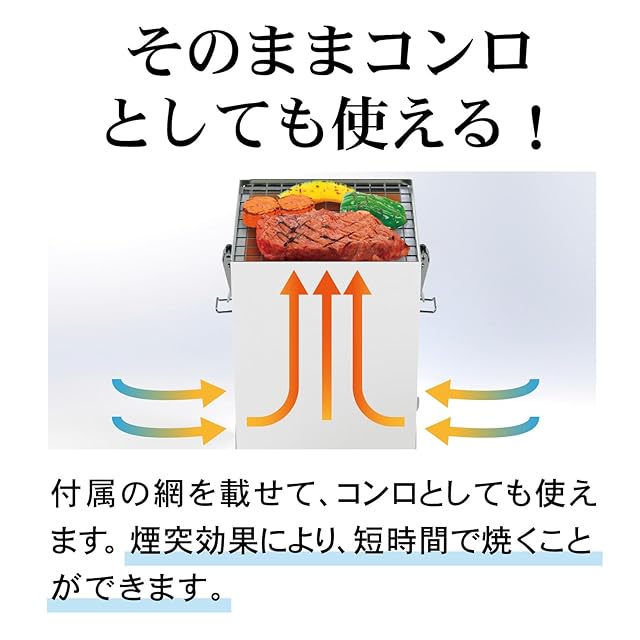 【コンロとしても使える】付属の網を載せて、コンロとしても使用できます。煙突効果により、短時間で焼くことができます。