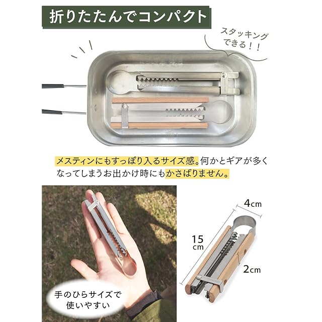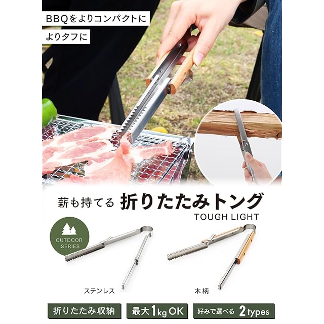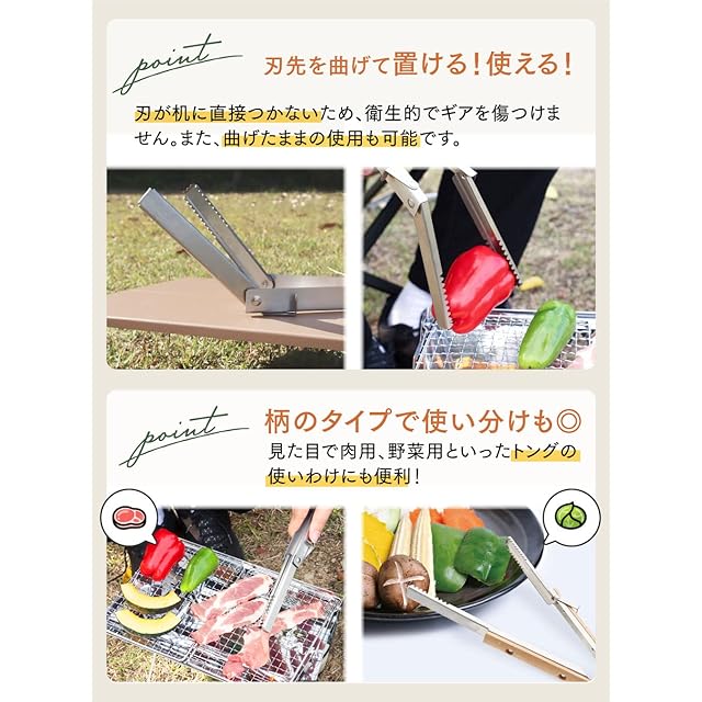 ・【刃先が広がらない / 木柄とステンレスで使い分けできる】折りたたみコンロを使う上で気になる刃先の広がりも改善しました。大きく重たい物を持った後でも刃先が元の状態に戻るため、何度でも繰り返し使うことができます。また、木柄とステンレスの2種類があるため、生肉用、野菜用など使い分けをすることができます。