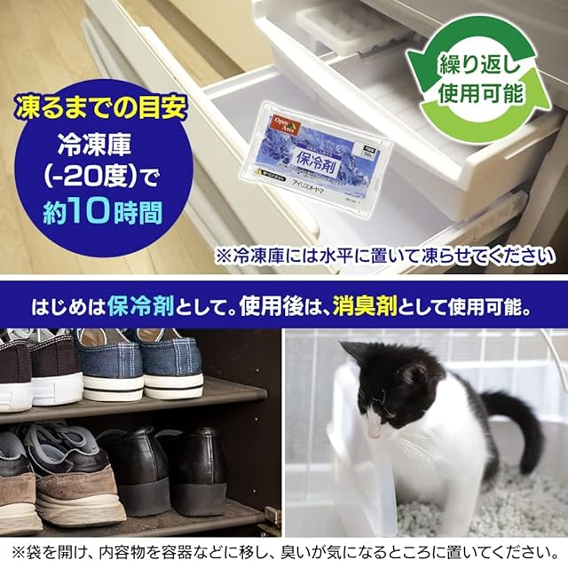 冷凍庫で凍結させて繰り返し使用でき、保冷剤として使用後は消臭剤として利用できます。