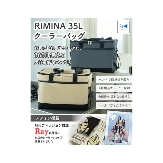 ◆365日使える大容量保冷バッグ/RIMINAの35L大容量クーラーバッグは、年中使える頼もしいアイテムです。アウトドアやスポーツはもちろん、お買い物や旅行など多岐にわたるシーンで活躍します。30Lを超える容量でありながら、わずか500gという軽量設計で、持ち運びも楽々。肩ベルトが付いているため、手持ちでも肩掛けでも利用できる3WAY仕様です。特にレジカゴサイズにぴったりのデザインは、お買い物後の持ち運びに便利。ベルトでコンパクトに折りたたむことができるので、使わない時も場所を取りません。見た目もおしゃれで、ツートンカラーが魅力のこのバッグは、日常使いからアウトドアまで幅広く対応します。