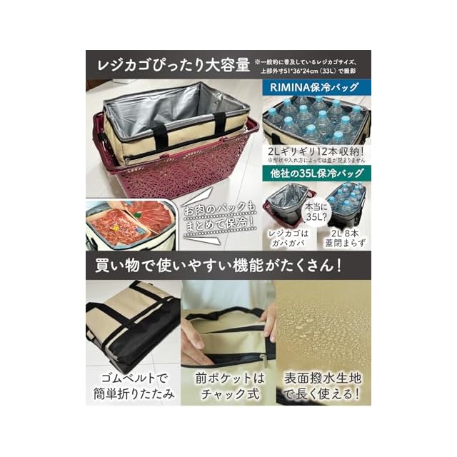 ◆超大容量、でもコンパクトに収納/このクーラーバッグは、35Lの大容量にもかかわらず、コンパクトに収納できる優れもの。レジカゴサイズで、お肉のパックや2リットルのペットボトルもラクラク収納可能です。特にゴムベルトを使えば、使わない時には簡単に折りたたんでコンパクトに収納できる点が魅力的です。Wファスナー付きで荷物の出し入れがしやすく、また、防水設計が施されているため、冷たい飲み物や氷を入れても水漏れの心配がありません。こうした多機能性と使い勝手の良さが、日常のお買い物やレジャーを一層便利にしてくれます。
