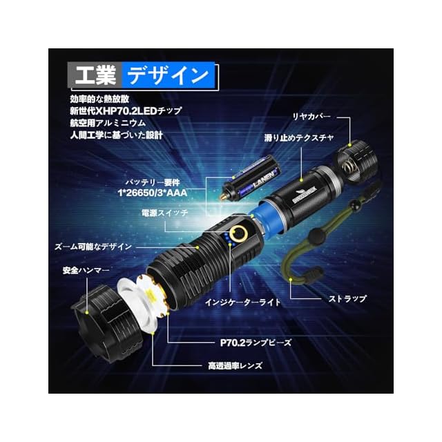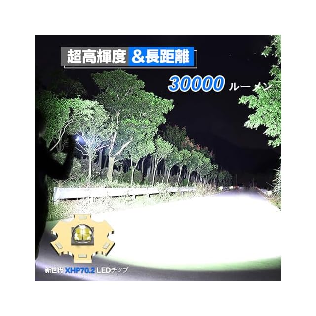 懐中電灯 led 強力 軍用 最強 Shadowhawk 超高輝度 30000ルーメン フラッシュライト 充電式 ハンディライト XHP70.2 超強力 懐中電灯 ライト電池式 ハンドライト 明るい flashlight IP67防水 5モード調光 ズーム調整可能 防災/登山/夜釣り/地震/災害/停電対策/非常灯にも使用可能