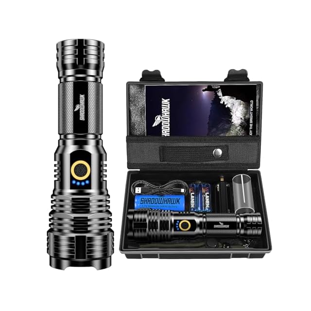 【進化版!30000ルーメン 懐中電灯 led 強力 軍用 最強】Shadowhawk S1915 懐中電灯 強力 は最新のアップグレードされたXHP70.2LEDチップを搭載するので、通常のLED懐中電灯の10倍の超強力ライトを実現できます。このledフラッシュライトは最大30,000ルーメンの驚異的な明るさを生成できます。120平方メートルの部屋を問題なく照らしたり、最大500メートル離れた物体に焦点を合わせたりすることができます。懐中電灯やアクセサリーはギフトボックスに入れることができ、持ち運びにとても便利です。 この高品質の懐中電灯セットは、パートナー、家族、友人、同僚などへのプレゼントにも最適です。