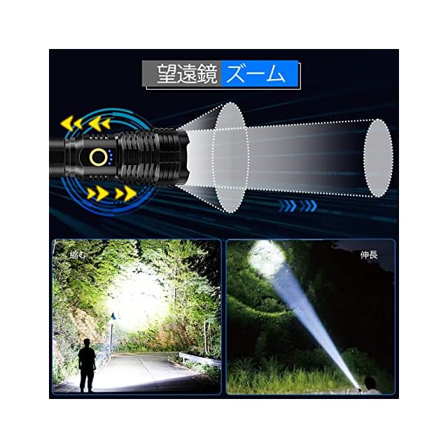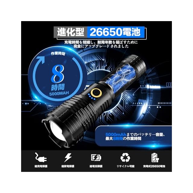 【懐中電灯 充電式&パワフルな電池&電量表示】S1915 充電式 懐中電灯は、充電時間を短縮し、耐用年数を延ばすために完全にアップグレードされました。1回の充電で最大12時間持続できる新しいアップグレード充電式5000mAh 26650 バッテリーを採用しています。他の5000mah バッテリーと比較して、その放電エネルギーは50%高くなっています。この電池式懐中電灯はUSB-Cケーブルを使用するので、より便利に充電できます。高輝度 懐中電灯の電源インジケーターは、バッテリーの使用量(100%、75%、50%、25%)を明確に知るのに役立ちます。