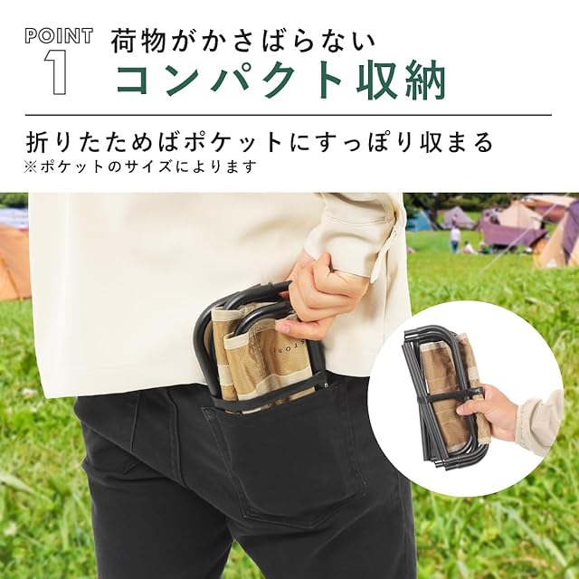 簡単組み立てなので休憩したい時にすぐに座ることが可能。且つ超コンパクト設計のため持ち運びも苦になりません。