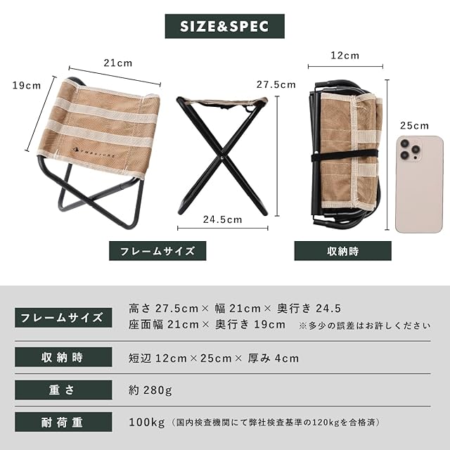 サイズ : 組み立て時:座面 幅 : 21cm / 奥行き : 19cm フレーム 高さ : 27.5cm / 幅 : 21cm / 奥行き : 24.5cm : 収納時:短辺 : 12cm / 長辺 : 25cm / 厚み : 4cm ※多少の誤差はお許しください。 重さ : 280g 耐荷重 : 100kg(国内検査期間にて検査済)