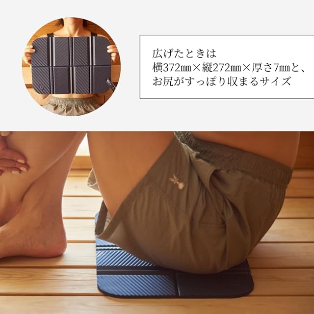 ① コンパクトで超軽量なサウナマットを広げるとお尻がすっぽり収まる満足なサイズ感に。サウナ以外に登山やハイキング、フェスなどのアウトドアシーンでも活躍します。