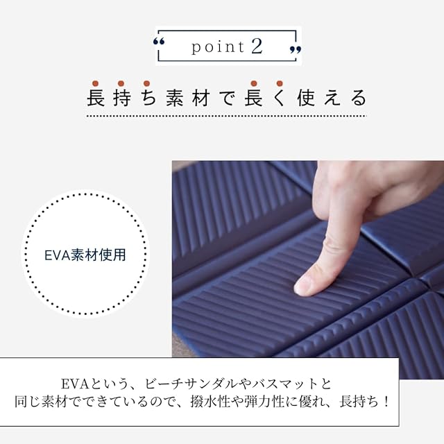 ③ ビーチサンダルやバスマットに使われる「EVA素材」を使用。一般的なサウナマットに使用される発泡ポリエチレンより、柔らかく弾力性のある素材のため長く使用でき、より良い座り心地に。