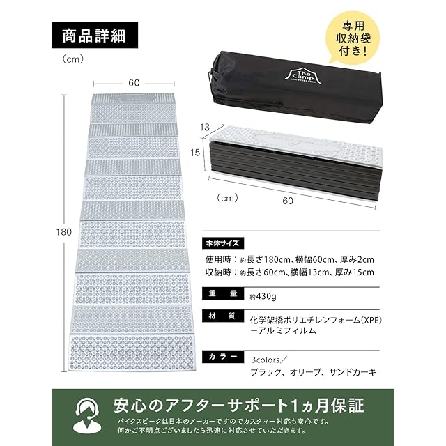 ✅【仕様 / セット内容 /メーカー】【仕様】本体サイズ:(約)幅60cm×長さ180cm×厚さ2cm(使用時)、幅15cm×長さ60cm×厚さ13cm(収納時)、重量:約430g、材質:XPE(化学架橋ポリエチレンフォーム)+アルミフィルム【セット内容】本体×1、収納袋×1【メーカー】PYKES PEAKは日本のメーカーです。カスタマー対応も日本人スタッフが日本語で丁寧に対応いたします。初期不良や故障などの場合は、ご気軽にご連絡ください。製品を含めご対応させて頂きます。