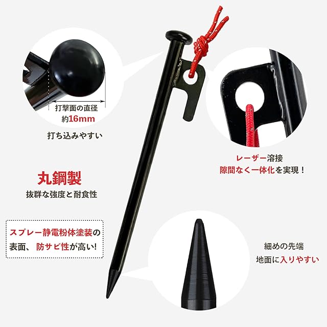 【強度抜群なペグ】直径約10mmの丸鋼で作られて、この太さなら砂利や石が混じった固い地面でも深く、強く、しかも曲がらずに打ち込める。