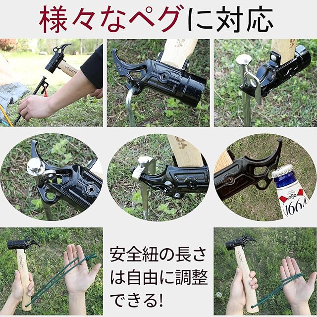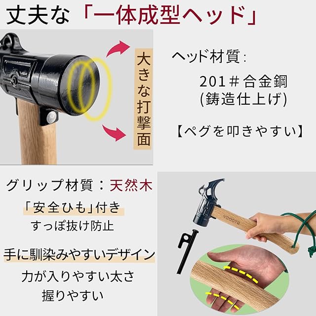 【使いやすい】 適度な重量を持つ丈夫な一体型ヘッドで、手に馴染みやすくて初心者にも使いやすいです。ペグ打ちとペグ抜きだけではなくて、アウトドアでボトルの栓抜きとしても使用できます。