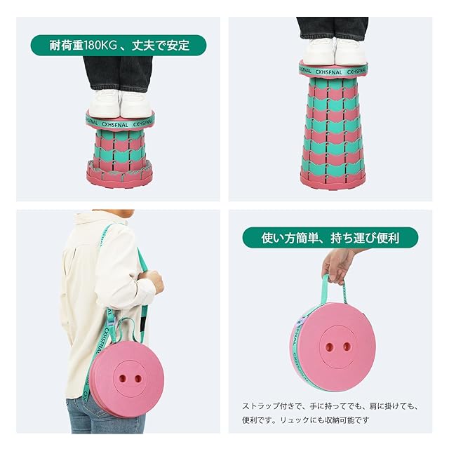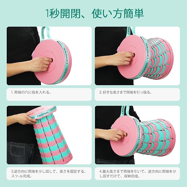 【使い方簡単、持ち運び便利】使い方簡単:少しひねりを入れながら両端を引くだけでスツールが完成。収納は逆方向に少しひねりを入れながら両端を押すだけで収納可能。また、ストラップ付きで、手に持ってでも、肩に掛けても、便利です。