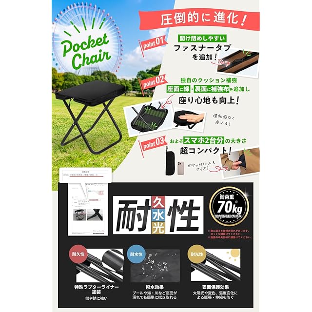【既存商品を大幅改善!業界最高水準の耐久性】折畳椅子の脚部のパイプはラプターライナー塗装という特殊塗装を行うことで、表面の保護をより強力に行い、耐久性・耐水性・耐光性を大幅に向上しております。また座面には610Dオックスフォード生地を採用し、撥水性・耐摩擦性・通気性を向上し、より長く安心してお使いいただけます。座面裏側には補強布を追加し、座った際に沈み込みづらく、より強靭な座面へと進化させました。この軽さとコンパクトさで国内認定試験で耐荷重は驚きの70kg!さらに使用方法が難しいというご意見からフルカラーの取扱説明書と動画を用意しました。安心してご使用いただけます。
