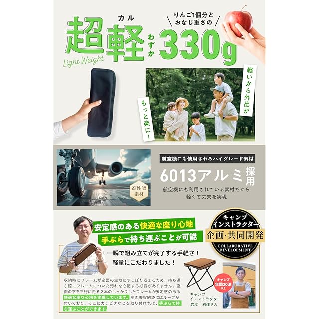 【重さは超軽い330g】利たたみ椅子本体の脚部は航空機にも利用されている高性能素材「6013アルミ」を使用することで軽くて丈夫を実現。りんごおよそ1つ分の330gという限界の軽さを実現しました。バッグに入っていても重たく感じることが極限まで少なく設計しており、お出かけにぴったりな折り畳みイスとなっております。