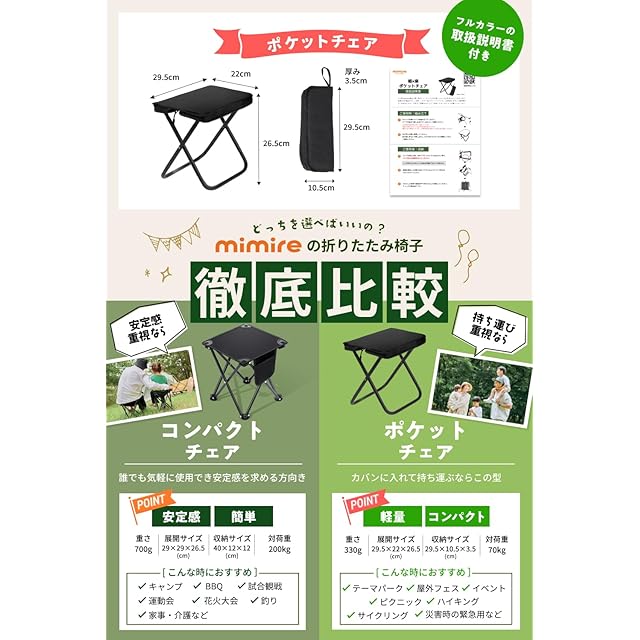 【超コンパクトテーマパークなどのお出かけに最適】家族でのお出かけなどにカバンに携帯できるようスマホ2台分の超コンパクトなサイズを実現しました。さらに座面がそのまま収納袋になるので、持ち運びも便利な簡易椅子となっております。持ち手部分にカラビナをつければ腰などにもぶら下げることが可能となっております。テーマパークや屋外フェス、万博などのイベント、ピクニック、サイクリング、災害時の緊急用、アウトドア、キャンプなどご使用方法は無限大です。