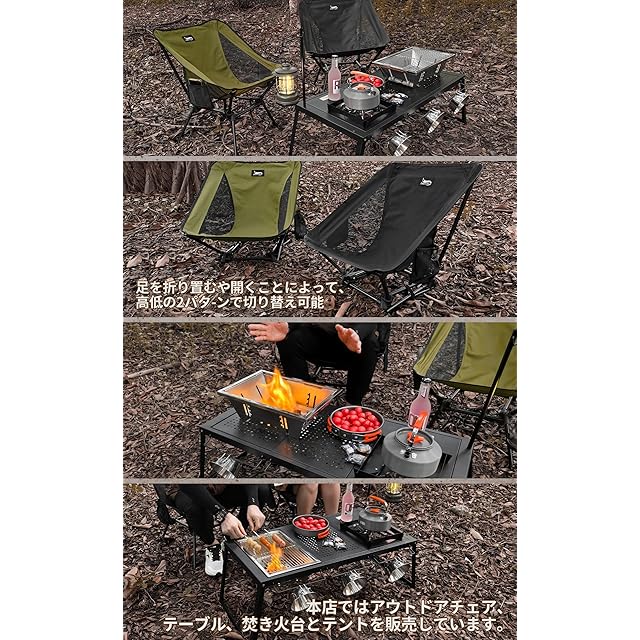 ✅【高さ両パターンで切り替え可能】足を折り畳むや開くことによって、グランドとノーマルスタイルの両パターンで切り替え可能。焚き火に近づき暖まることや、足を伸ばすことができ、より多くのシーンで大活躍!✅【四角形フレームでより安定】伝統的なキャンプ椅子と違い、座面の下のフレームは四角形となっていて、全体的に安定性がアップグレード!
