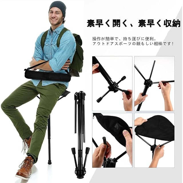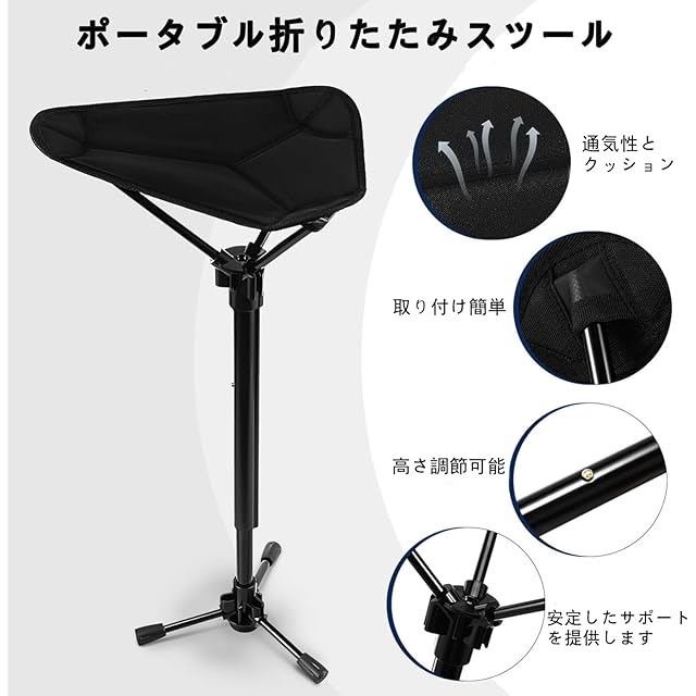 【高さ調整機能】:スタンディングチェア この携帯用折りたたみ式スツールは、お好みの高さや最大級の快適さに合わせて座面の高さを調整できる調整可能なデザインを採用しています 。