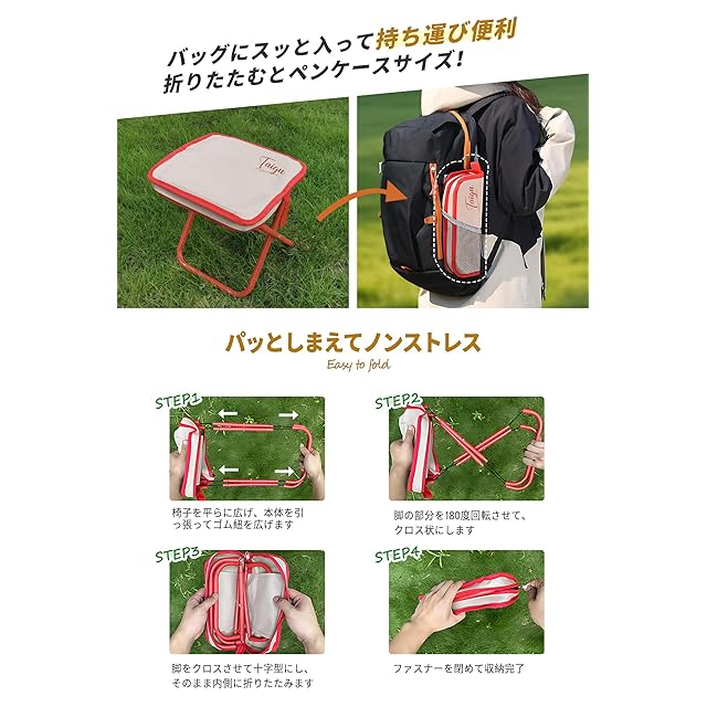 【超コンパクト&抜群の携帯性】 収納サイズはわずか12×28×7cm。折りたたみ傘サイズでバッグやリュックの横にすっぽり入る折りたたみ椅子軽量持ち運び仕様。レジャーや旅行でも荷物にならず、いつでもどこでも活躍します。