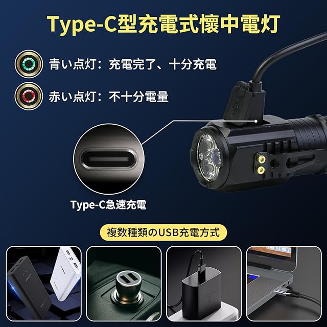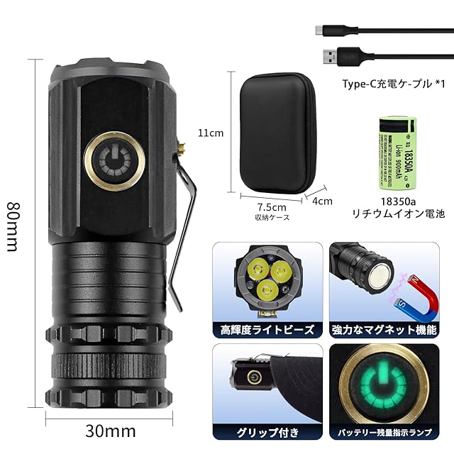 【⚡Type-C高速充電&バッテリー交換可能】 このハンディライトは、1500mAhのバッテリーを内蔵しており、Type-C急速充電に対応しています。1段階照明モードでは約2時間、2段階照明モードでは約3〜4時間の連続使用が可能です。さらに、最長60日間の超長時間待機が可能なので、いざという時にも安心です。バッテリー残量インジケーターも搭載しており、残量が10%以上の場合は緑色、10%未満の場合は赤色に点灯します。充電中は赤色、満充電になると緑色に変わるので、電力レベルを簡単に把握できます。当社のLED懐中電灯は、大型のものほど連続使用時間は長くありませんが、その分小型で持ち運びに特化しています。※ご注意:金属製の懐中電灯は、長時間の使用で熱を持つことがありますが、これは多くの製品に見られる正常な現象であり、使用に影響はありませんのでご安心ください。