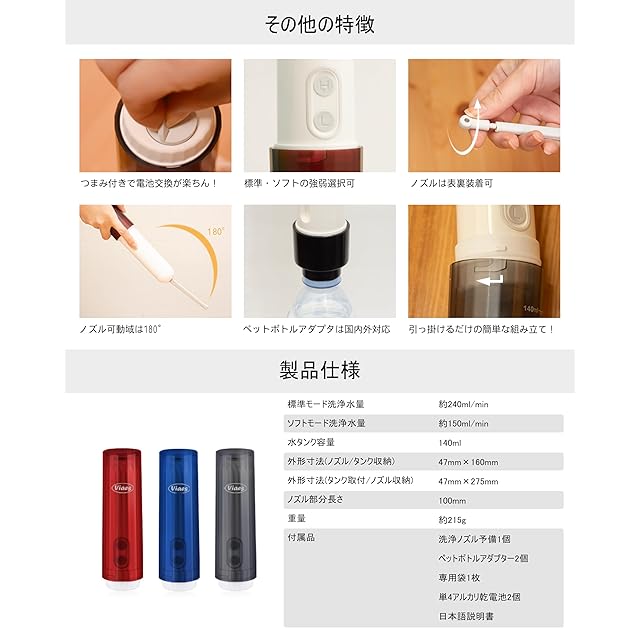 いつでもどこでもおしりが洗えるViaes(ビアエス)携帯おしり洗浄器の電池式タイプです。(注:温水にはなりません) ペットボトル専用ジョイント(日本用1個、海外用1個)、日本メーカー単4電池2本、中が見えない専用ポーチ1枚、ゴミが詰まった時の交換用に予備ノズル1個が付属。すぐに使える充実のセット内容です。